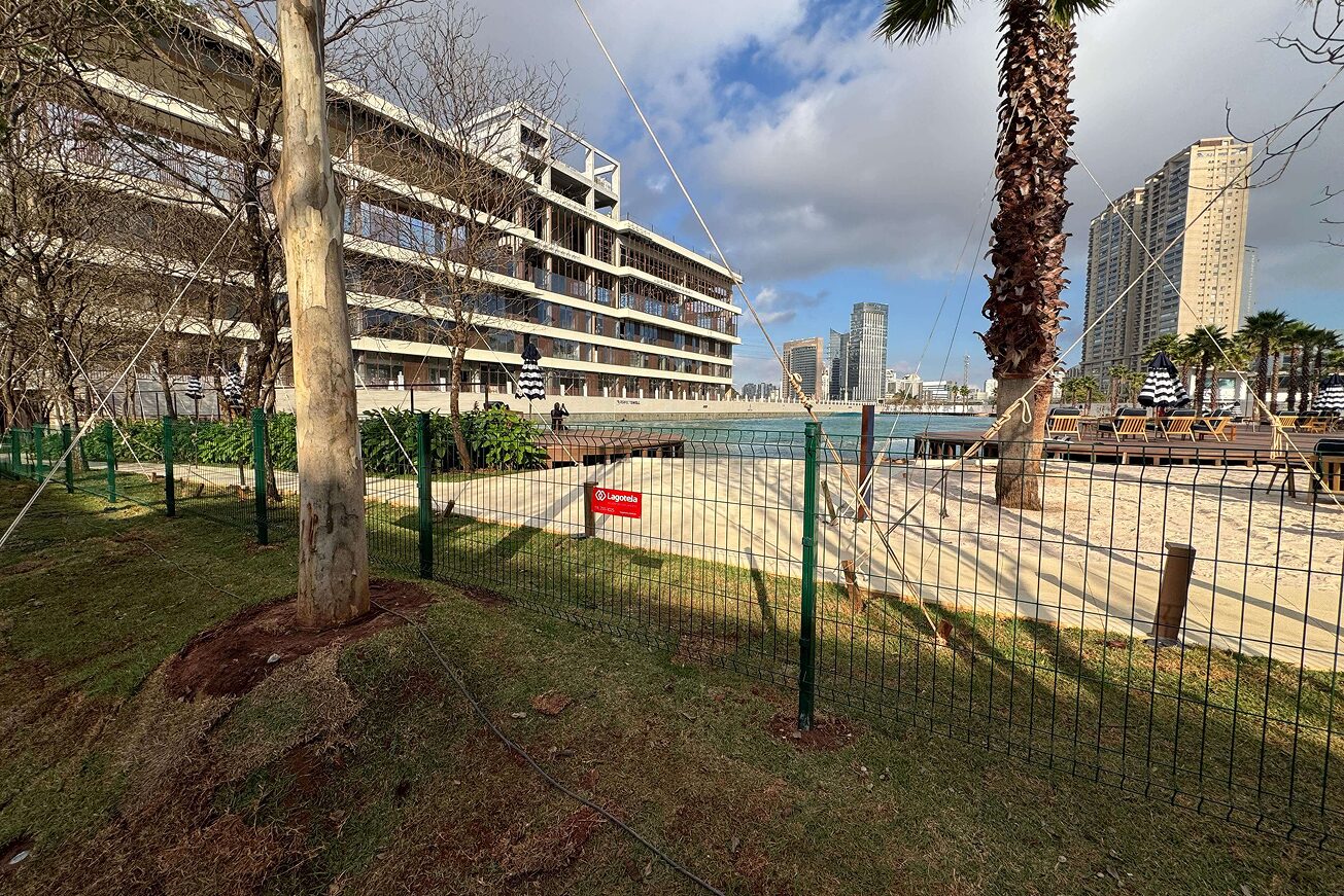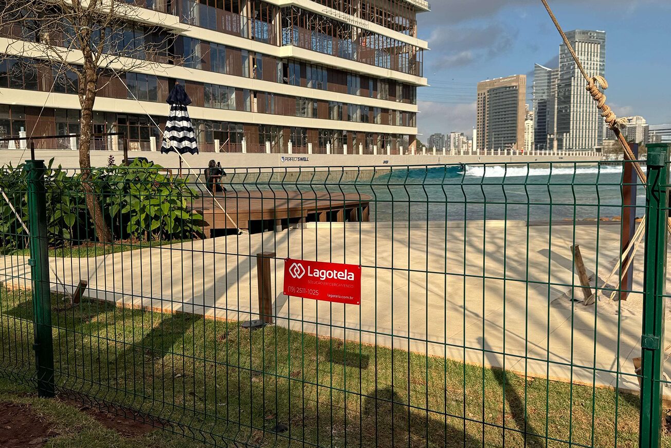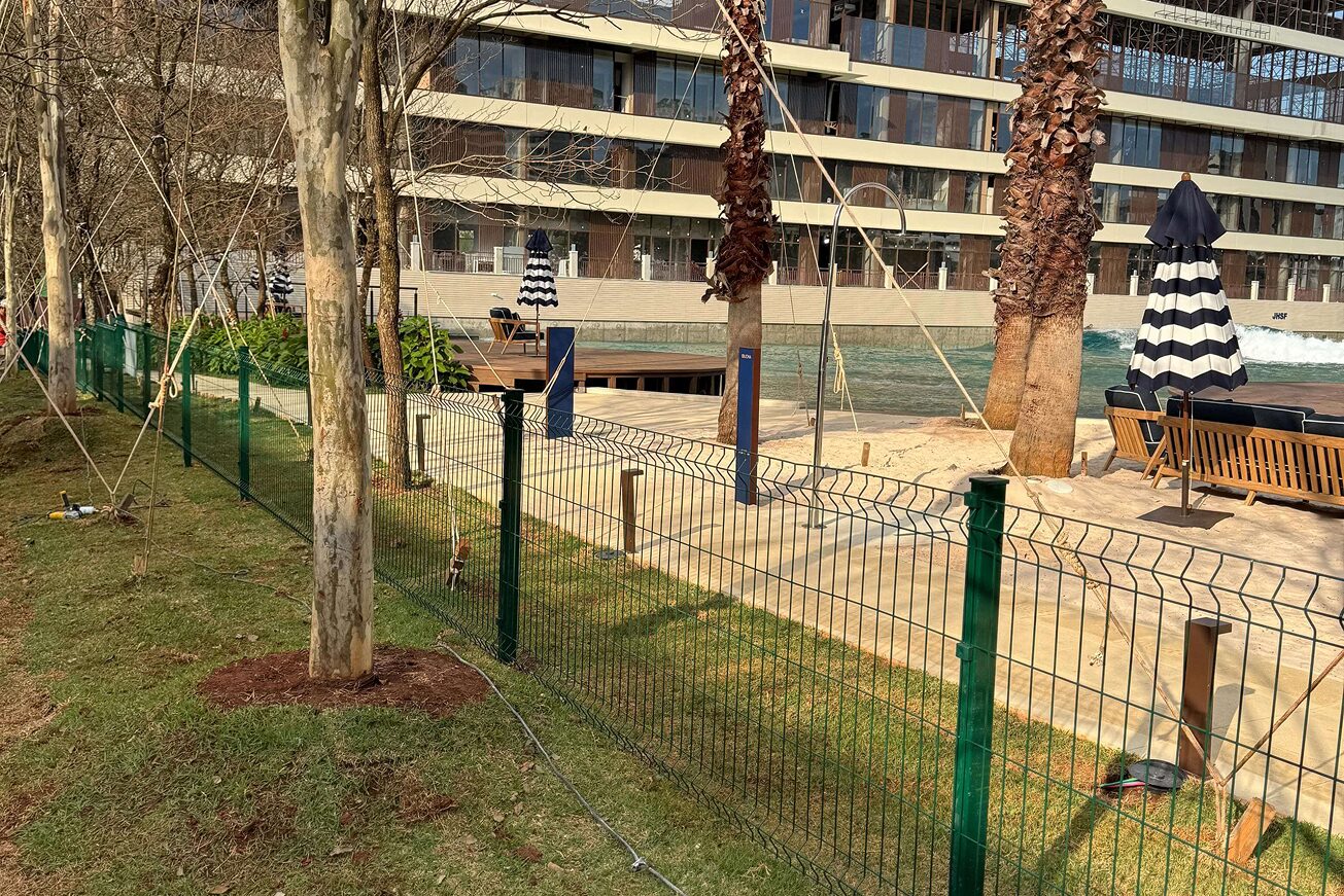 Obra de alto padrão com cercamento total do complexo, utilizando gradil 3D e portões metálicos, garantindo segurança e sofisticação ao ambiente.