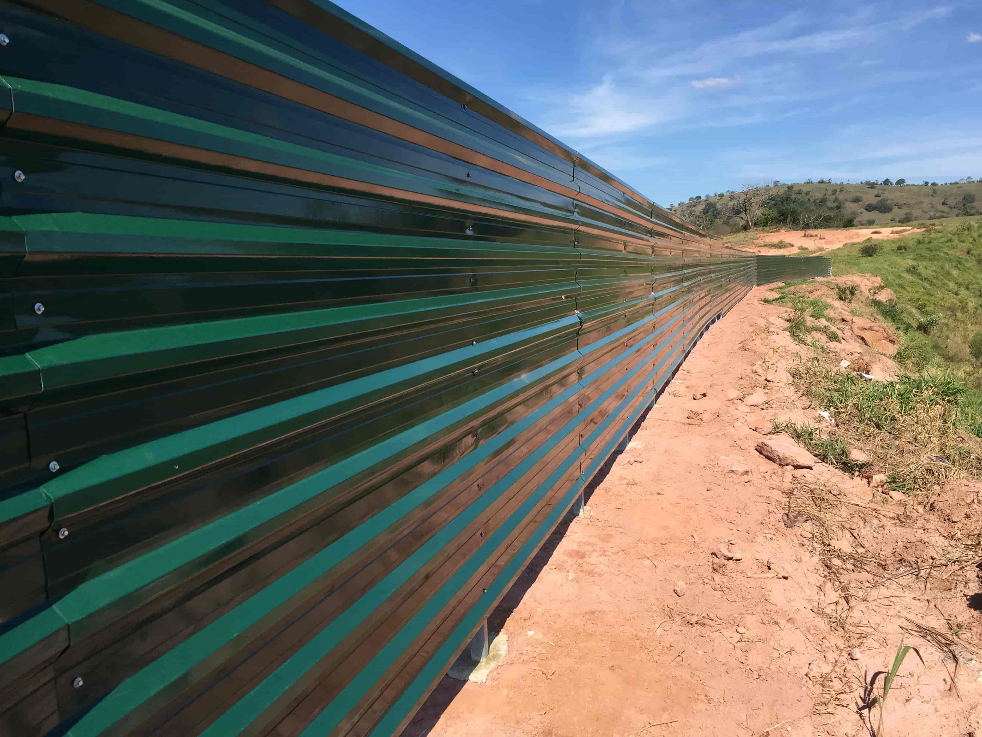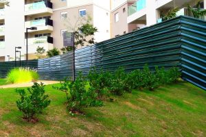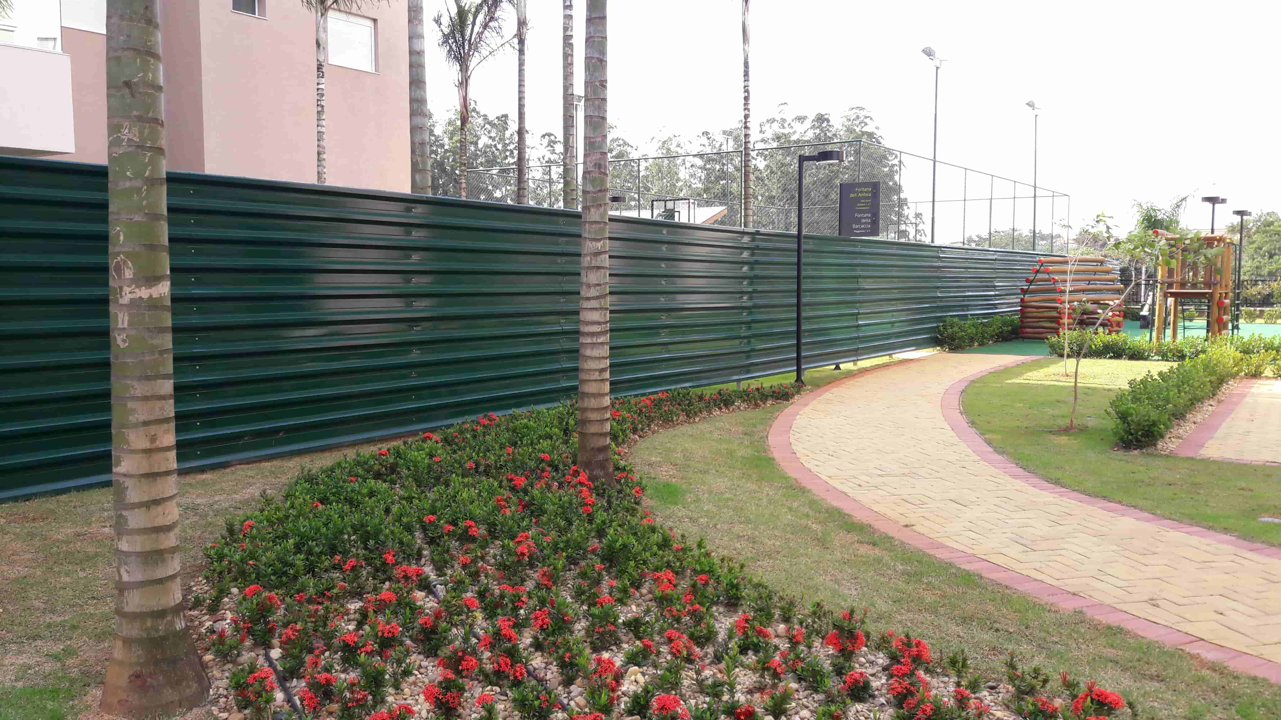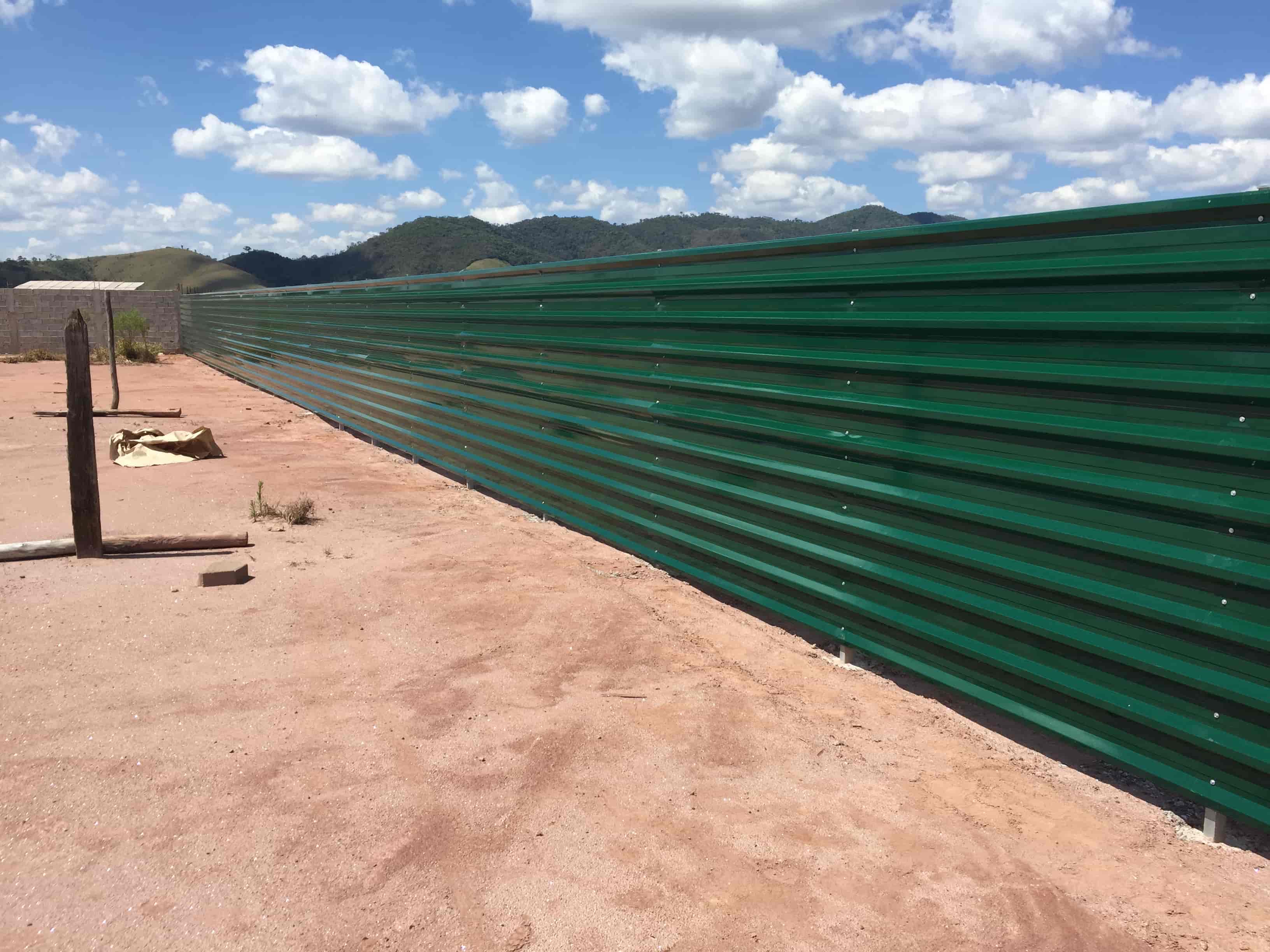 O sistema com montantes em bases de concreto permite montagem rápida e firme, enquanto o acabamento de qualidade proporciona uma aparência organizada e valorizada ao entorno da obra.